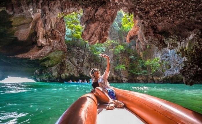 It’s **sea-cave canoeing** in an inflatable canoe, usually guided/paddled through caves and “hongs” (hidden lagoons).